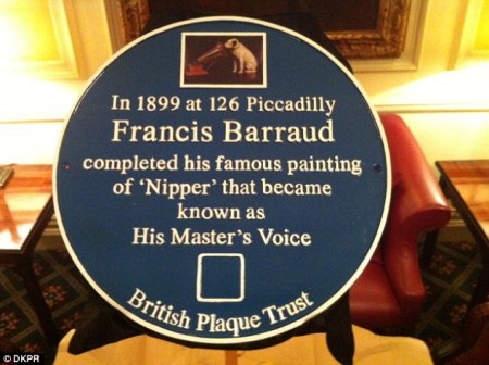 126 Piccadilly has long been part of the Cavalry & Guards Club, which is where this plaque to Nipper was erected in October 2014 by the British Plaque Trust.