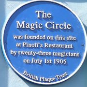 In 2016 a plaque was unveiled to the Magic Circle at Pinoli’s Restaurant, Wardour Street, London, the organisation having been founded there just over 100 years earlier.. In 1905, at a meeting held in the large hall above the renowned Pinoli Restaurant in Wardour Street, 23 amateur and professional magicians formed a new magic club that was to become The Magic Circle. The meeting was chaired by the wonderfully named Belgian magician Servais Le Roy. Fast forward a hundred years to Wednesday April 13th 2016,and hundreds of magicians and members of the public gathered outside what was Pinoli’s at 17 Wardour Street, to celebrate this momentous occasion with the unveiling of a British Plaque Trust, blue plaque.